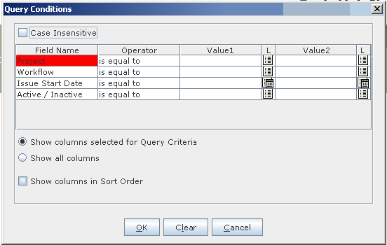 Issue Start Date : Start date of the issue, between dates can be selected by setting Operator is between